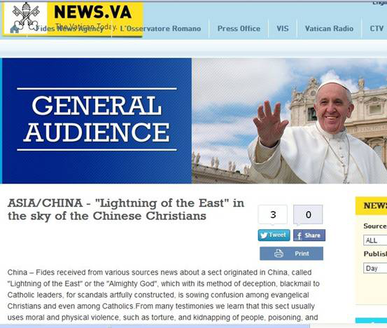 바티칸 교황청, ‘전능신’에 대한 경보 기사 발표