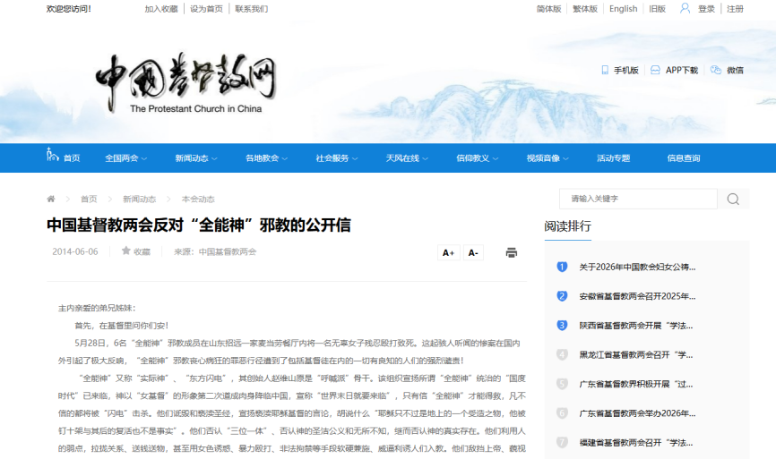 중국기독교양회는 ‘전능신’ 이단이 《성경》을 비방하고 모독한다고 판단